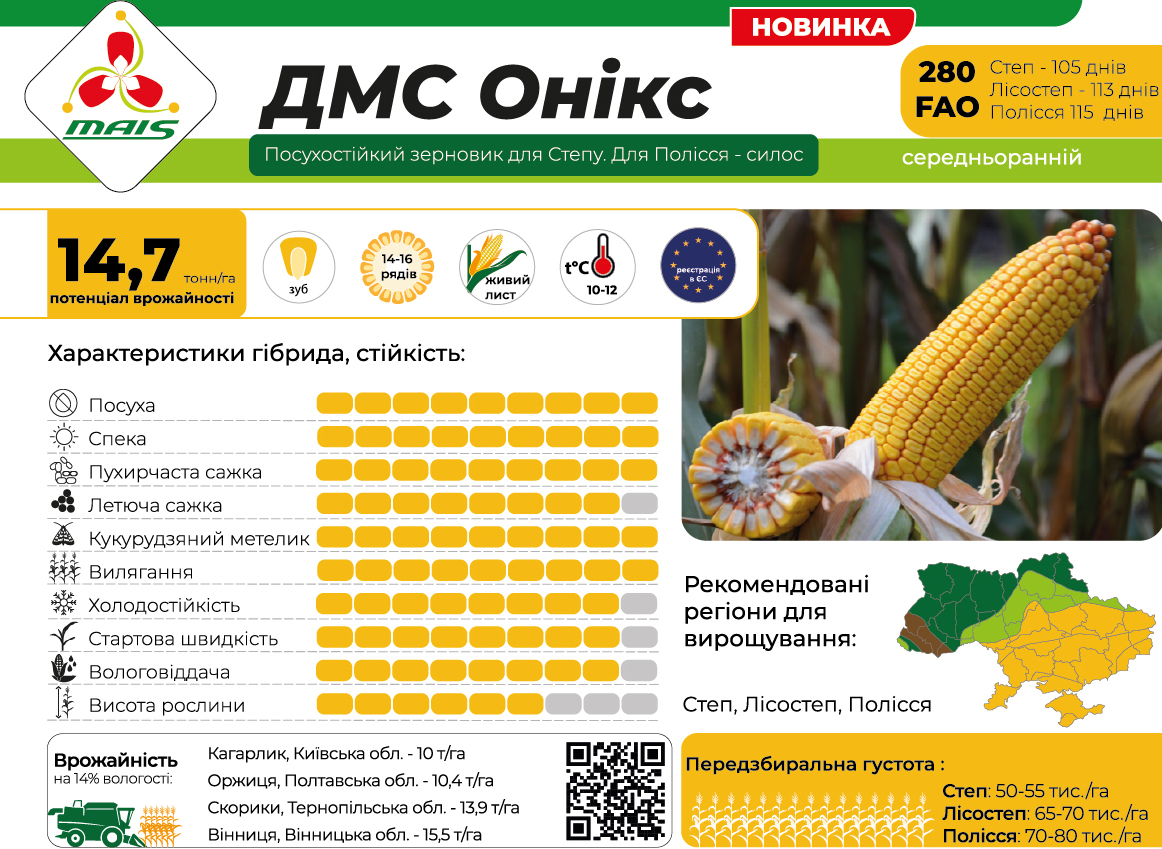 ДМС Онікс - це новинка середньораннього гібриду кукурудзи від компанії МАЇС